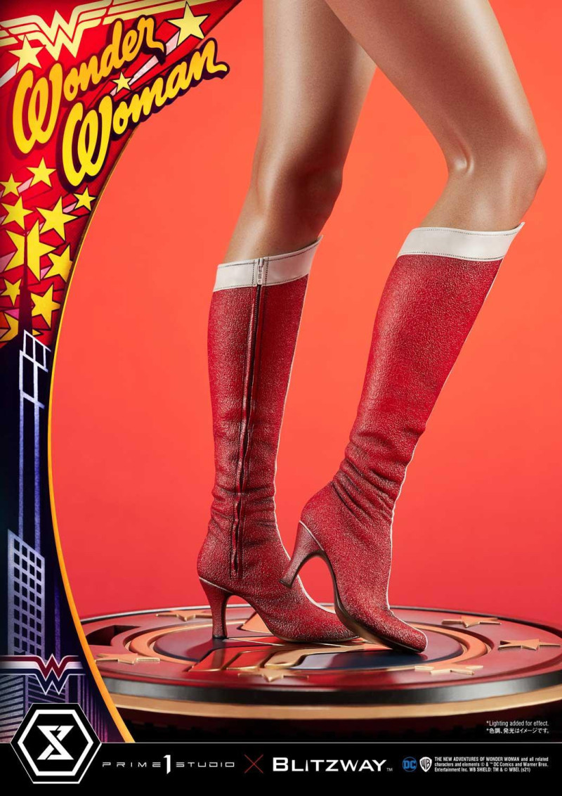 本作高約 69 公分,是根據琳達·卡特(Lynda Carter)在 70 年代《神力女超人》電視劇中飾演的神力女超人形象為題製作,再現了當年風靡美國、性感又強悍的女神樣貌,從金鷹標誌紅色馬甲、星星藍短褲、長靴、腰際套索的服裝特色,到人物的湛藍雙眼、波浪卷長髮、細緻臉蛋與火辣的身形曲線......皆考究地製作,頭雕部分更是有著細膩的膚質紋理,鮮豔的口紅、睫毛都十分逼真。
