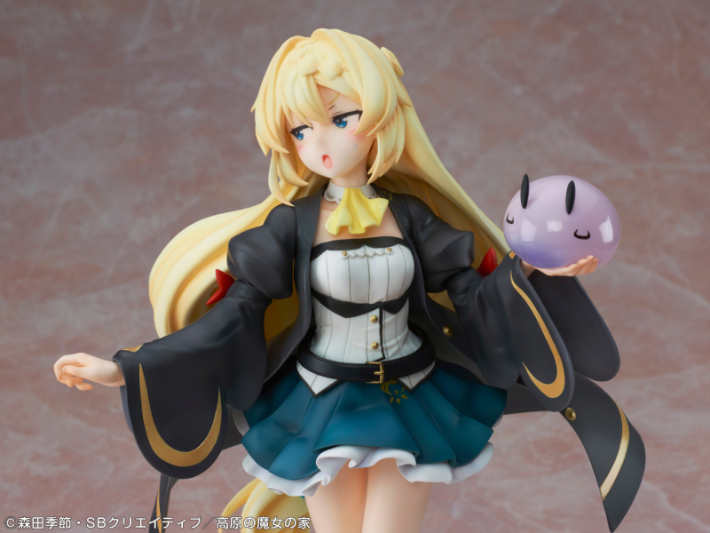 MEDICOS「亞梓莎」1/7 比例模型,尺寸約高 25 公分,將人稱「高原魔女」的亞梓莎立體化,身穿劇中的魔女造型服裝,斗大的魔法帽、鑲有金邊的黑色斗篷以及俏皮的短裙,整體不僅細節豐富更帶有飄逸的動感~手上拿著半透明材質打造的史萊姆,搭配底座的草地、魔法石碑等,展現作品的世界觀。而金色長髮與臉上甜美的微笑也如實還原,帽子可以取下,呈現兩種不一樣的造型!