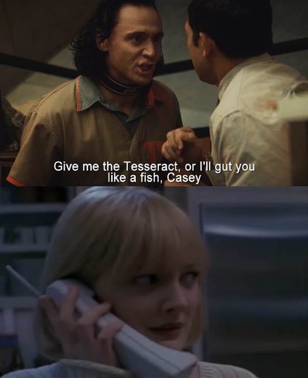 洛基威脅TVA負責管理證物的Casey交出宇宙魔方,不然就把他切成魚。這句話致敬了《驚聲尖叫1》裡的經典台詞,而該幕被威脅的角色同樣名為 Casey。