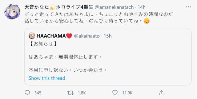 四期生的天音彼方(天音かなた) 也轉推赤井心宣布停止活動的推特,表示希望大家不要擔心,已經有跟他談過了,請大家安心,慢慢等待唷。