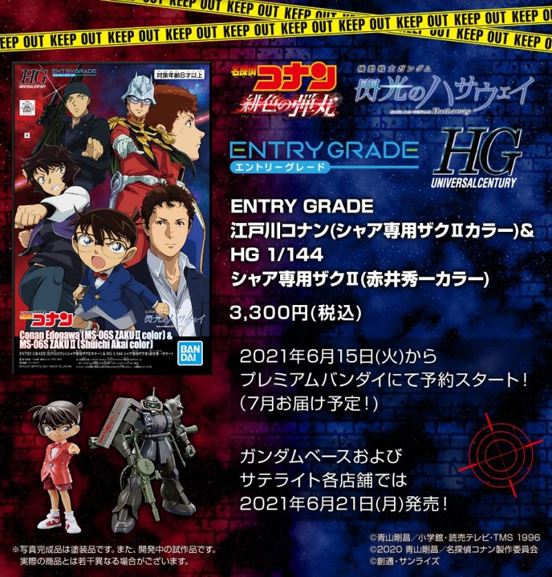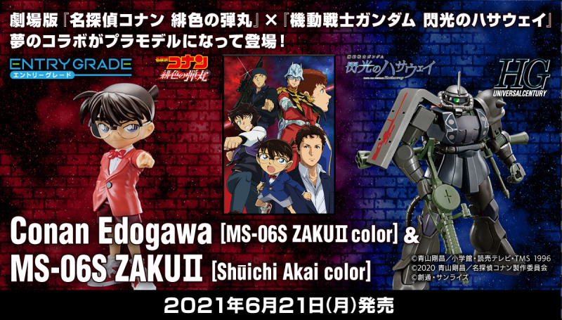 日本好評熱映的劇場版《名偵探柯南:緋色的彈丸》與《機動戰士鋼彈:閃光的哈薩威》將展開夢幻合作!日本 BANDAI SPIRITS 公司今日(15日)公開了由旗下 HOBBY 事業部推出的聯名商品:「ENTRY GRADE 江戶川柯南(夏亞專用薩克Ⅱ配色)& HG 1/144 夏亞專用薩克Ⅱ(赤井秀一配色)」組裝模型。參考售價為 3,300 日元,預計將於 2021 年 6 月 21 日《名偵探柯南》作者青山剛昌生日當天發售!