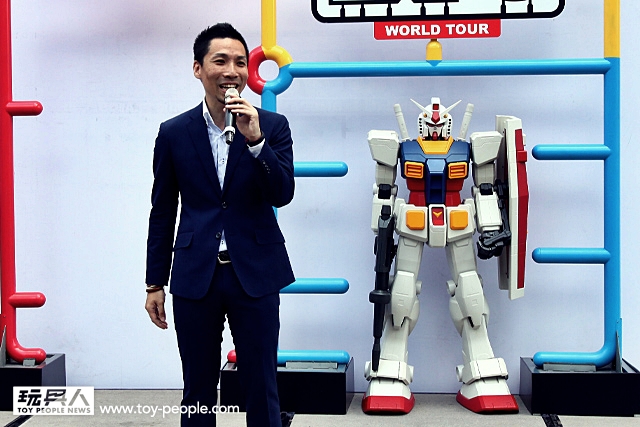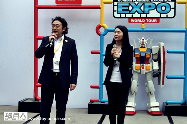 ▼ 展覽開始之前,由BANDAI 的主管門上台致詞。注意到胸口閃亮亮的徽章了嗎? 那可是『機動戰士鋼彈』35週年紀念的相關人士才有的喔!~