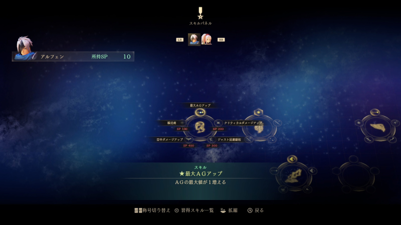 角色們可透過故事發展、達成任務、參加活動等方式獲得獨特的稱號。依據獲得稱號的不同可學習相對應的「技能」;或在選單的技能盤畫面中,消耗SP(Skill point)學習技能,玩家可依照自己理想的戰鬥方式學習技能來強化角色。
