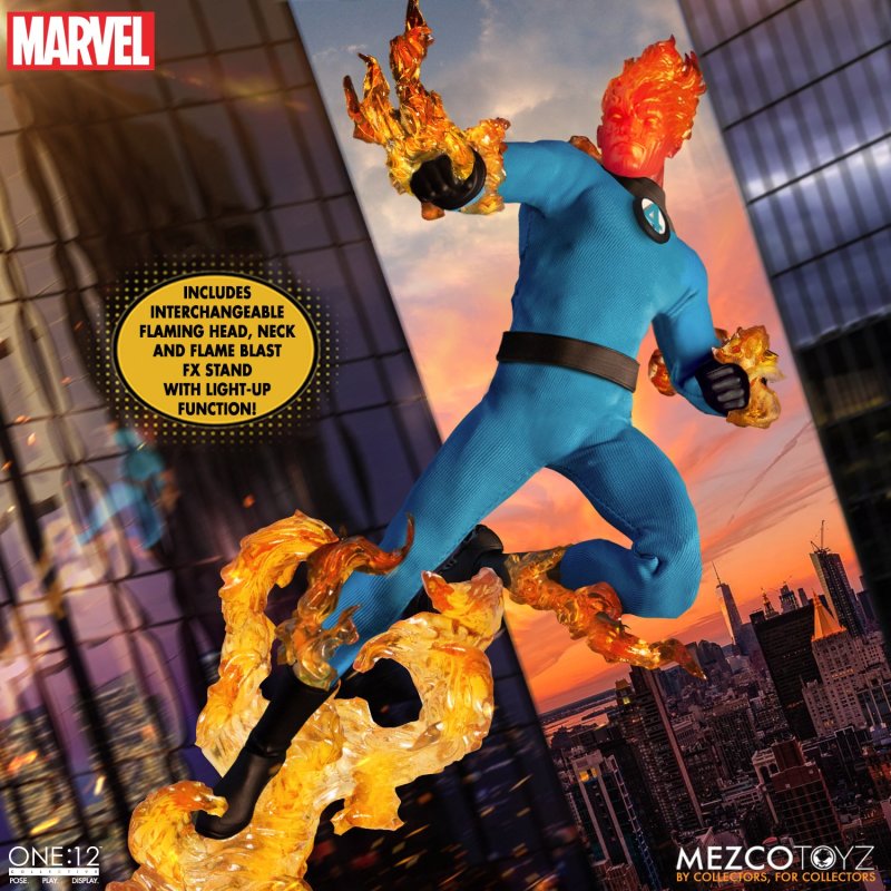 霹靂火(Human Torch)高約 17 公分,全身可動來到 32 處,有兩種普通狀態的頭雕跟一顆能力發動時、熊熊燃燒的火焰頭雕,隨人偶有附上大量具有漸層視覺效果的火焰特效,超帥!