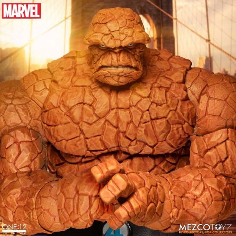 石頭人(The Thing)高約 17 公分,全身可動共有 26 處,共附上四種表情的替換頭雕,以及偽裝用的帽子、墨鏡、大衣,橘色體表的岩石質地擁有細緻的刻畫,粗壯身軀所帶來的把玩手感也相當令人期待。