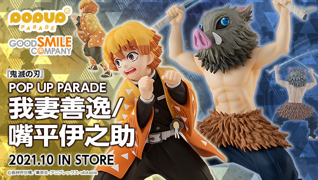 「POP UP PARADE 嘴平伊之助」,尺寸高約 14 公分,根據動畫版視覺圖為題設計、並採用與前作相同比例打造,將伊之助戴著招牌山豬面罩、高舉雙刀生氣勃勃的姿態立體化。精壯的肌肉線條,以及腰間披掛鹿毛、腳邊綁著熊毛等毛茸茸的細節皆細膩刻劃;刀刃破損如鋸齒的雙刀與明亮的山豬大眼十分生動!除了單獨展示之外,搭配炭治郎、禰豆子和驚嚇中的善逸,就能精彩還原動畫視覺圖上四人同時面對敵人的場面!