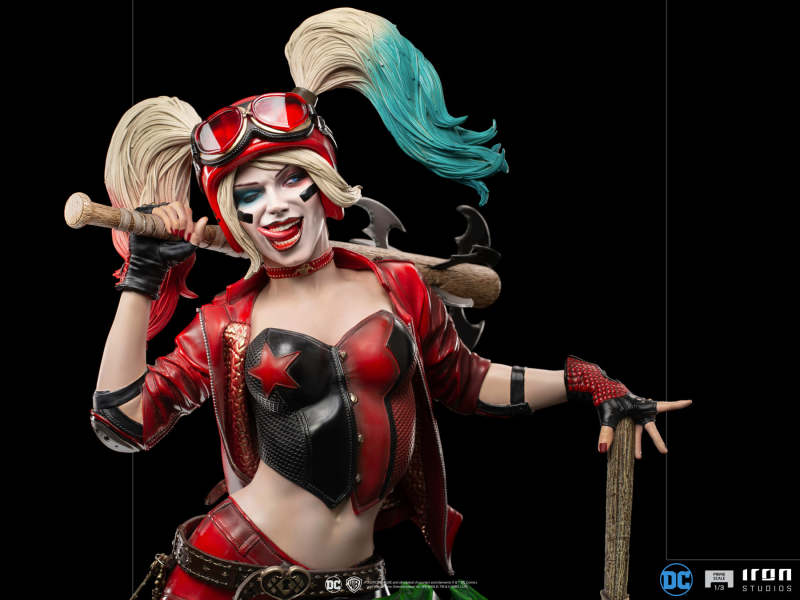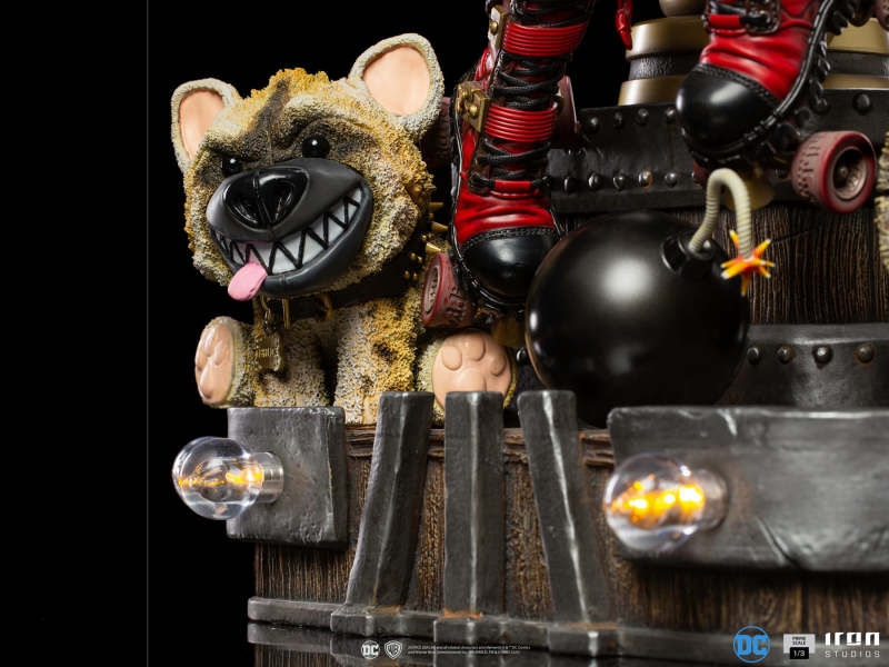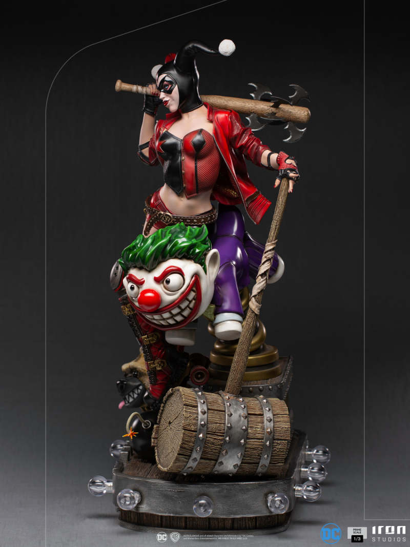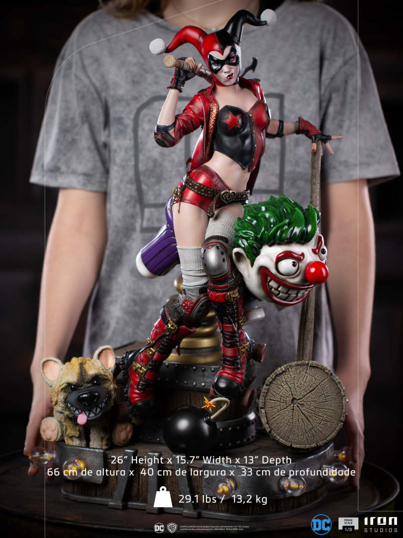 本作高約 66 公分,哈莉·奎茵身穿紅黑配色馬甲、短褲、短外套,腳上套著護膝跟四輪溜冰鞋,不只左手撐著的木槌相當巨大,右手拿持的棒球棍還是殺傷力升級的蝙蝠飛鏢變體版XD,頭雕共有戴上頭套與眼罩、戴著安全帽與護目鏡,跟狂笑三種,底座部分也有豐富的細節,而且小丑造型搖搖馬、哈莉的愛犬還是以 Iron Studios 旗下另一系列「MiniCo」的設計風格重新詮釋,搭在一起有著十分有趣的視覺效果,底座還可以發光喔。