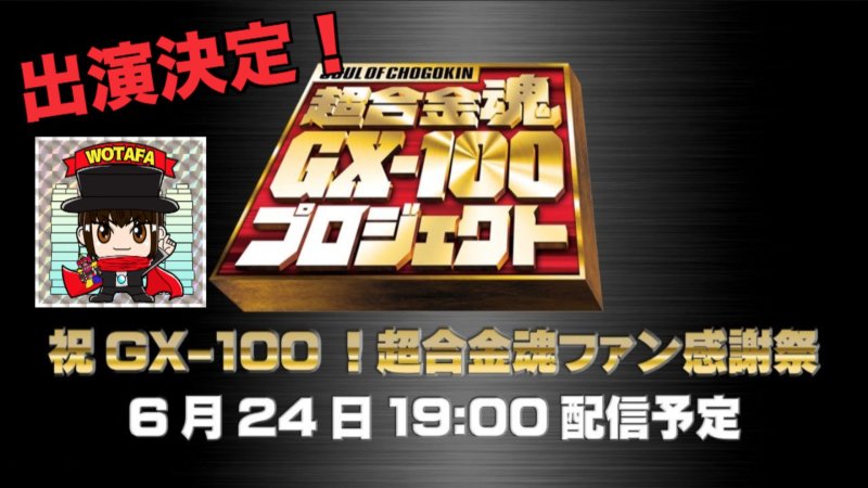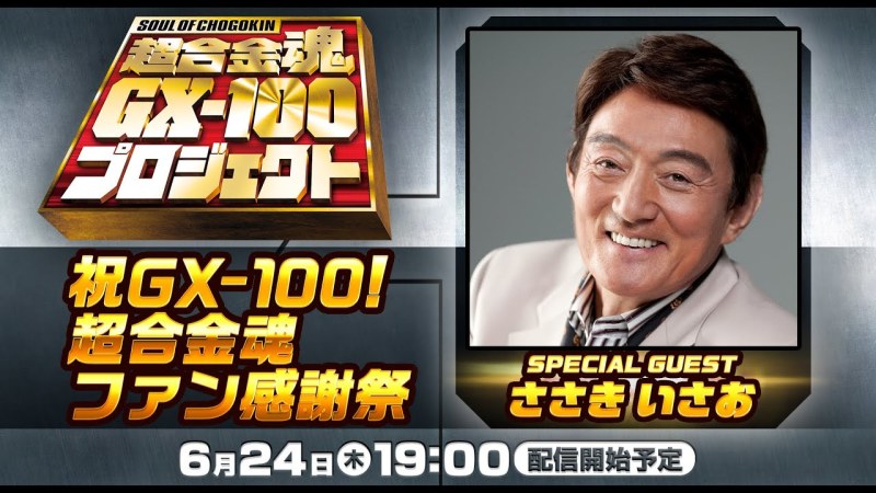 TAMASHII NATIONS 將在 06 月 24 日舉行『祝GX-100!超合金魂粉絲感謝祭』網路直播特別節目,介紹以 GX-100 為首的多款新作商品,特別來賓更邀請到曾為《科學小飛俠》鷲尾健配音、演唱《蓋特機器人》《宇宙戰艦大和號》《無敵鐵金剛英語版》動畫主題曲的佐佐木功先生、日本玩具收藏家 YOUTUBER wotafa參與演出!