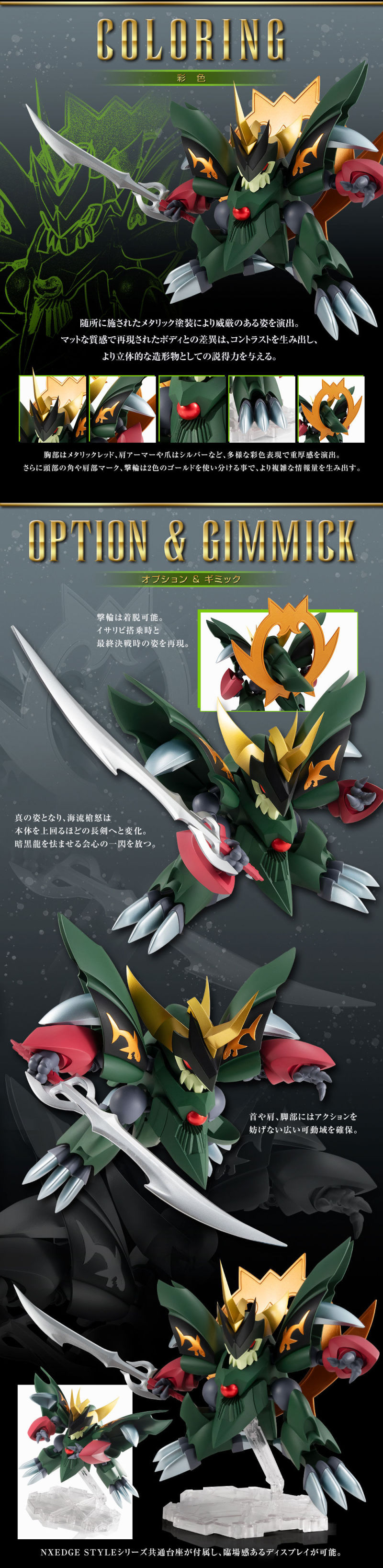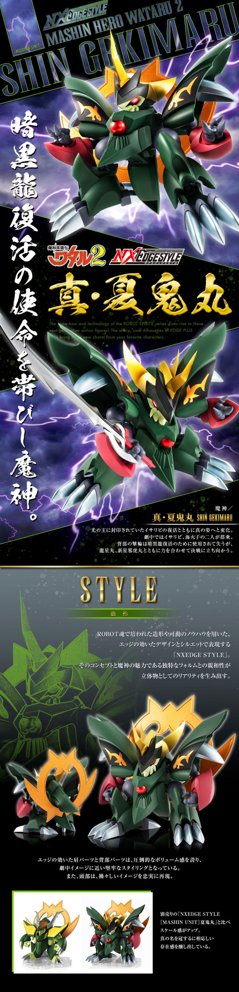 「NXEDGE STYLE 真・夏鬼丸」以 ROBOT 魂系列培育而來的造型.可動技術製作,運用洗練、銳利造型還原具形象,並透過消光色、金屬色調表現莊嚴、厚重的質感。變化為劍型的主武器「海流槍怒」使用新規零件,背部大型擊輪同樣能夠卸下,還附上造型手掌能再現必殺技「鬼虹拳」!