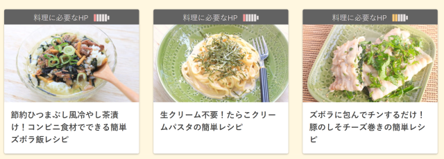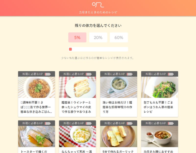 網站依照你殘餘的體力,分類出適合烹飪的料理菜單,