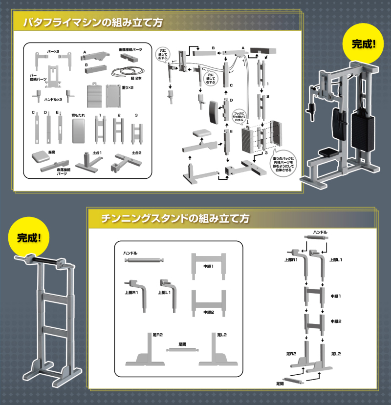 因應可動人偶的主流尺寸所打造的 1/12 比例「肌力訓練」轉蛋是由數量豐富的零件組裝而成、尺寸最高達到 16 公分左右的作品,只要你擁有一款約 6 吋左右的可動人偶就能輕鬆把玩出有趣的健身情境;這次的「肌力訓練 第二彈」包含 4 款,分別是蝴蝶機(バタフライマシン)、引體向上架(チンニングスタンド)、弧形仰臥起坐板/健腹器(シフトアップベンチ),以及健身滾輪、握力器、軟墊(ローラー&ハンドクリップ&マット)的組合,防疫期間不能出門運動,只好訂購一套來幫玩具健健身囉!