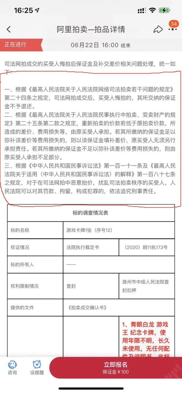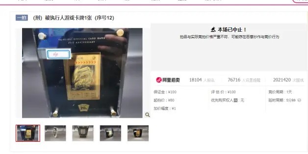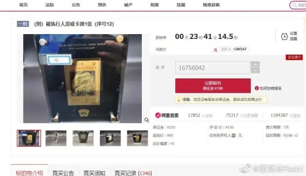 在先前日刊電電與各位小夥伴們聊過,在中國安徽省一名年輕公務員因涉嫌貪汙7000萬人民幣,不僅遭到當地人民檢察院移送法辦,所有財產更是遭司法拍賣,其中包含了該名公務員所收藏的《遊戲王》20週年紀念「黃金青眼白龍」以80元人民幣起標一事,儘管尚未得到真偽證實,但卻成功引起玩家們的高度關注與討論,並於2021年6月21日下午4點正式起標。