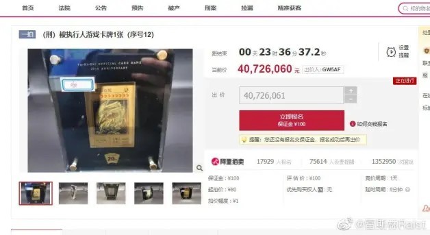 有趣的是,在競標會開始過了16分鐘,這張卡片的拍賣價格已經高漲了800萬人民幣,也從此刻起開始引起中國玩家們的關注。也因價格突然之間的飆升,到了第19分鐘則迅速來到了1675萬人民幣,隨後又倍增高漲到5000萬人民幣。