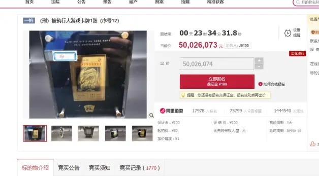 這場競標會估計也是有人抱著胡鬧的心態亂喊價碼,導致卡片拍賣沒多久就迅速飆升突破5000萬人民幣,但或許官方眼看矛頭不對,在競標進行到半個小時後,就突然遭到強行中止,其價位已經來到了8732萬人民幣後就宣布喊停了。