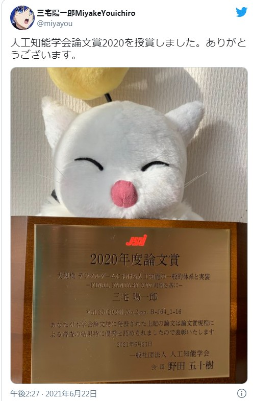 昨日(21)日本一般社團法人人工智能學會頒發了「2020年日本人工智能學會年度論文賞」,其實三宅陽一郎在10年就已經是AI領域的翹楚,現在更證實他作為日本AI研究第一人的權威性。