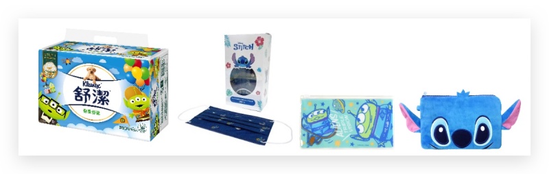 (圖示由左至右:三眼怪限定版包裝舒潔棉柔抽取衛生紙、Holic史迪奇限定款口罩、R Fun Shop口罩收納夾、史迪奇造型絨毛包,等外星萌主濾鏡PK好禮示意圖;實際獎項以Disney Style官方粉絲頁公告為準。)