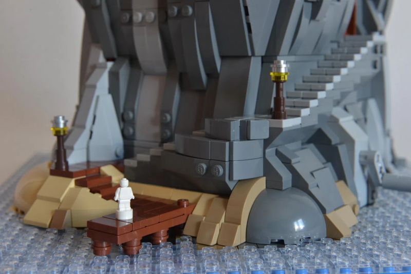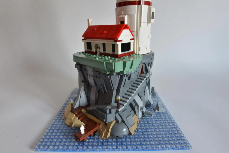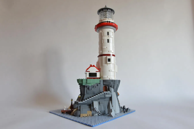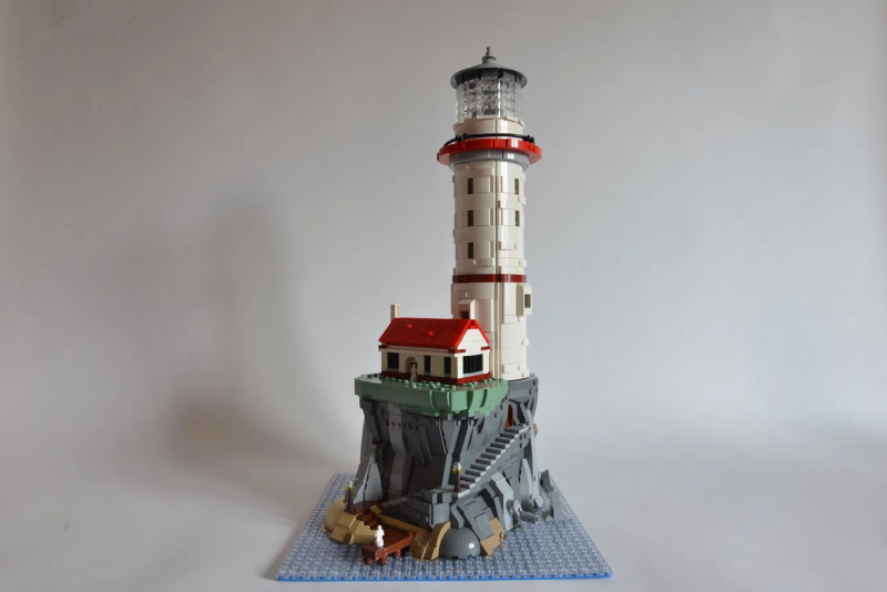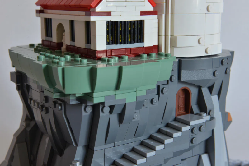 Sandro 表示他想要將「光」和「動作性(Movement)」作為創作中的兩大要素,同時要擁有搶眼的外觀,於是他打造出這座高度來到 47 公分的「燈塔」場景!從碼頭、燈塔出口的迷你樂高人偶可以發現 Sandro 是以微型比例的規格製作,整體包含了紅白色為主調的巨大燈塔、房屋,以及孤島上的懸崖峭壁,除了飽含層次感的岩壁塊狀線條之外,結合了岩石、木材質地的階梯構造也相當迷人,整體造型的完成性非常高。