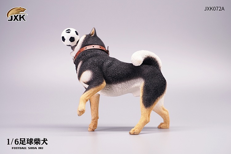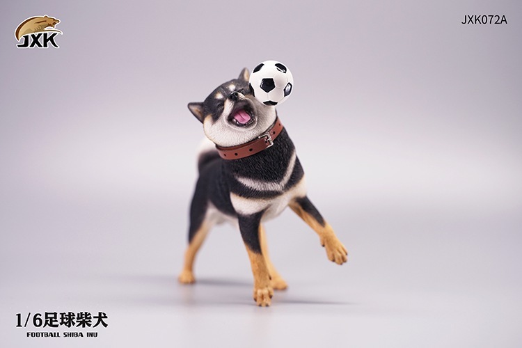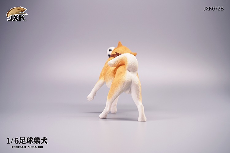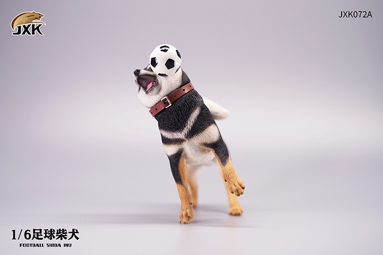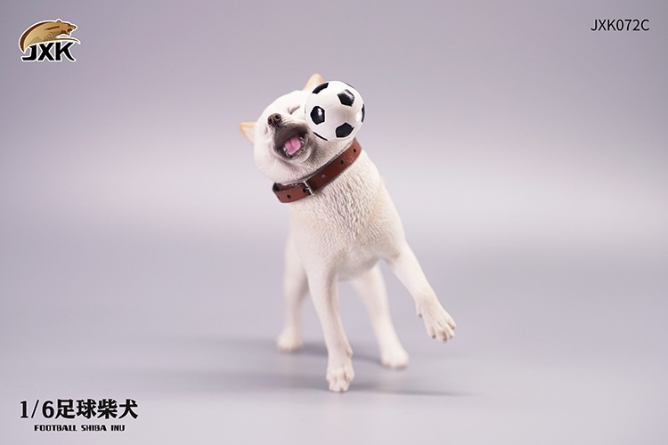 JXK Studio「足球柴犬」塗裝完成品,以蠢萌柴犬用生命接球!嘴邊肉慘遭足球擊中的搞笑模樣為設計~尺寸約為 10 × 7 × 10cm,一共有:足球柴犬A(黑柴)、足球柴犬B(茶色柴)、足球柴犬C(白柴)三種不同顏色的柴柴,雖然小足球砸在臉上的臉部表情相當引人注目,但在整體細緻上也毫不馬虎,刻畫出柴犬身上蓬鬆柔軟的毛,並施以柔和、擬真的塗裝,皮帶項圈等細節也十分精美。
