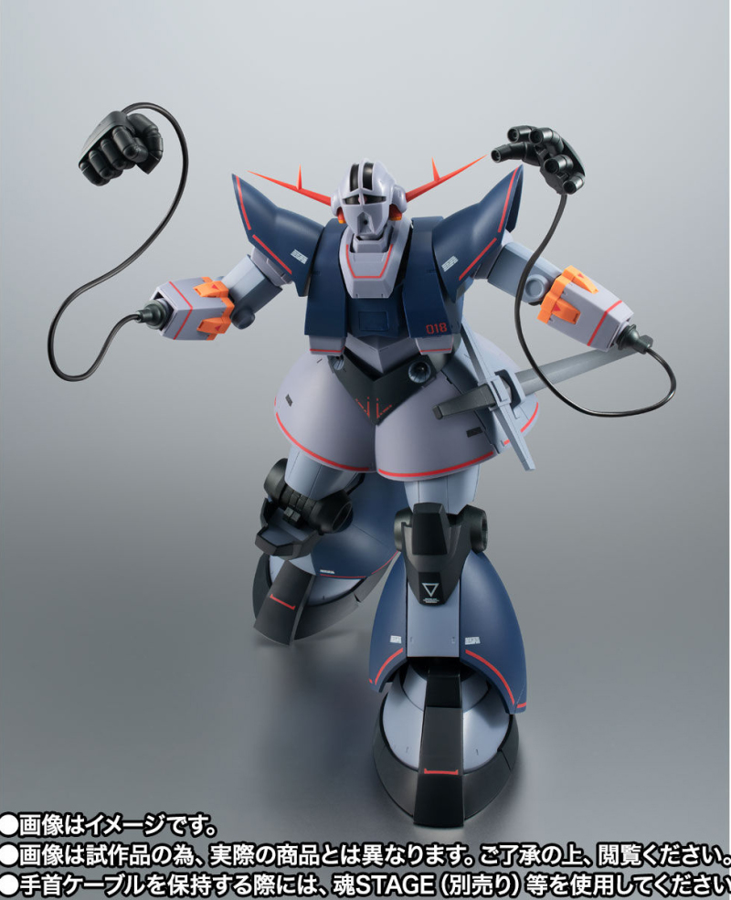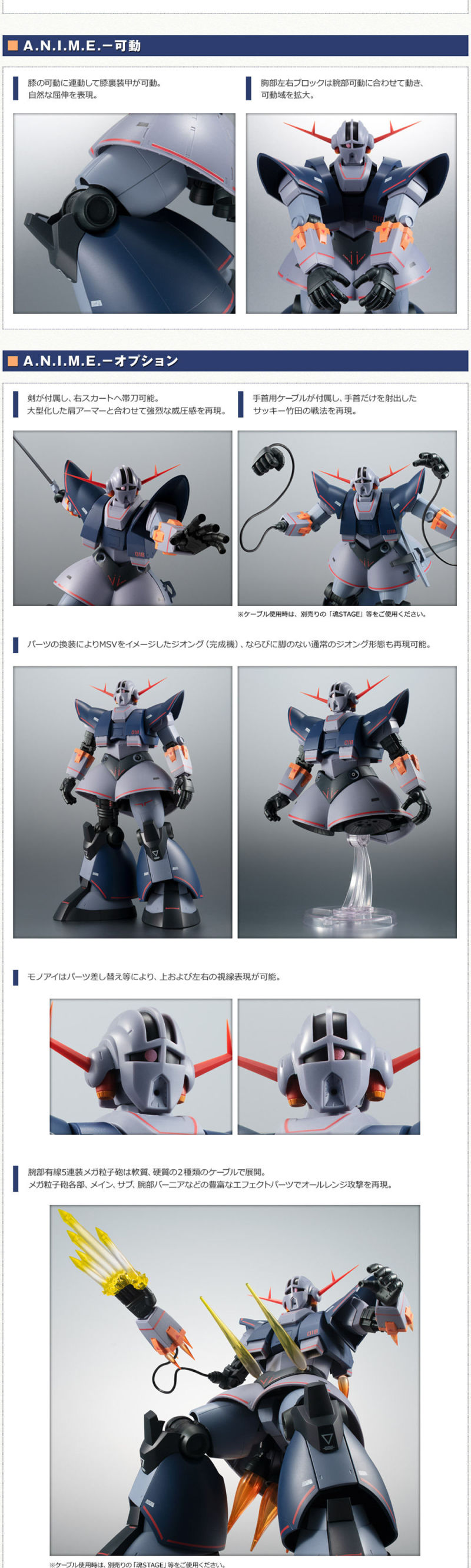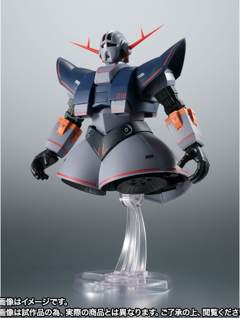 「ROBOT魂 全備型吉翁克 ver. A.N.I.M.E.」具備 25 公分巨大身軀,忠實再現圓滑厚重的裝甲造型,並印上豐富的機身標誌。胸甲兩側具備可動分割,讓雙手的可動範圍擴大,膝部轉動時則能連動裝甲,讓動作更加自然。