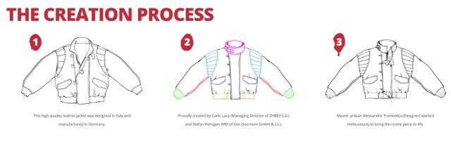 根據Funimation官方表示,此款外套是於義大利設計,德國製造,並由DYBEX S.A.董事總經理Carlo Levy、Van Doornum GmbH & Co. 董事總經理 Stefan Henzgen,以及知名設計師Alessandro Trombetta三方共同研討設計出的成品,不僅還原了在動畫電影中的風格,布料上所採用的真皮更是提升了整體的時尚性,只不過唯獨背後那藥丸圖案並未在該款夾克中呈現出來。