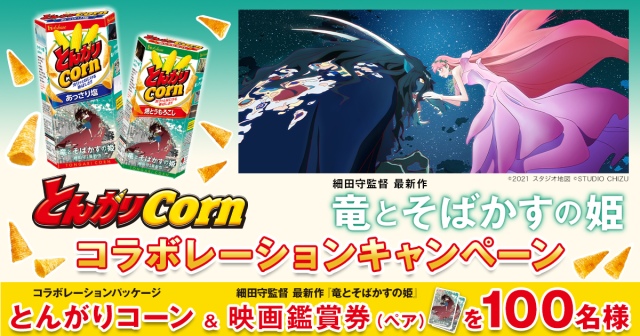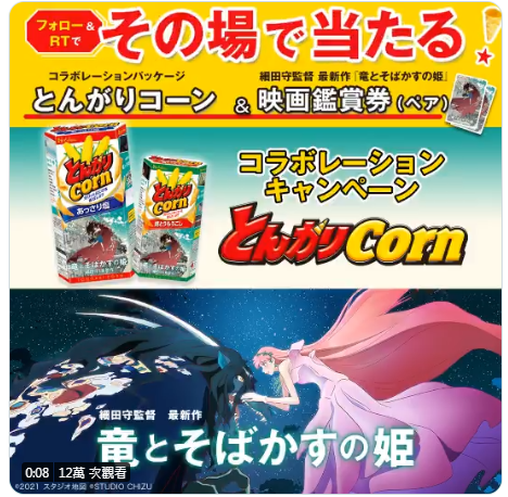 《龍與雀斑公主》是細田守導演的第三部以網路世界為主的動畫電影,預計於7月上映,近期除了各種公關大排場,例如「YOASOBI主唱幾田りら首次聲優演出」、「原著小說的發行」等大張旗鼓,目前還與HOUSE食品的香脆玉米零食「金牛角玉米餅」合作。