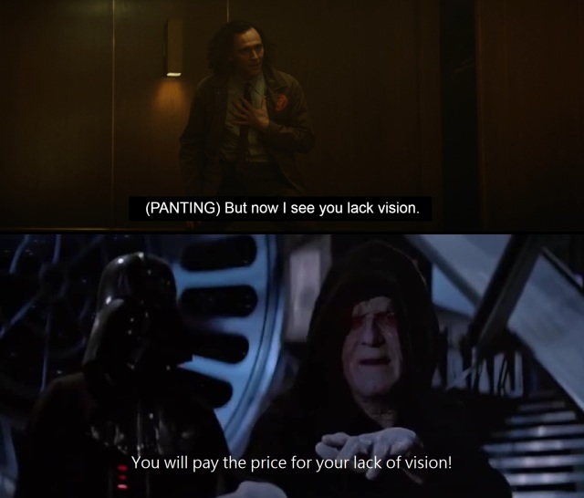 洛基在TVA與女洛基對峙,稱她「缺乏遠見」(lack of vision),這句話其實出自於《星際大戰:絕地大反攻》中白卜庭對路克天行者說的話。