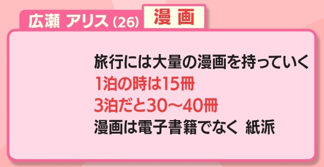 ▼廣瀨愛麗絲本身也是是十足的漫畫迷,出門旅遊時也不忘隨身帶著幾十本漫畫書,而且必須是實體漫畫才行