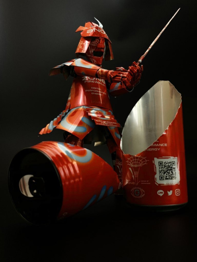 「鋁罐武士」 是由能量飲料品牌「ZONe」的罐裝來設計,當初看到這個鮮紅色的瓶裝,カイセイ立即聯想到了日本傳統的武士盔甲,立即實踐了他的創作靈感。