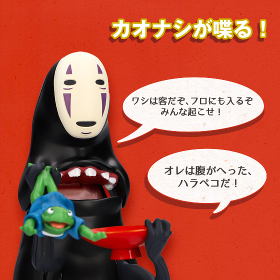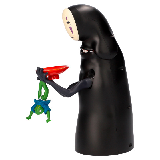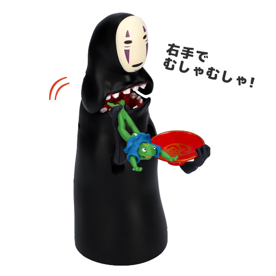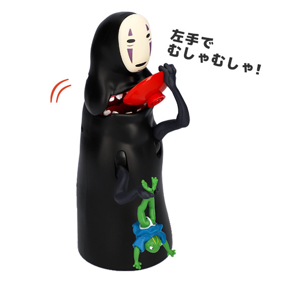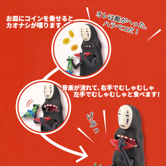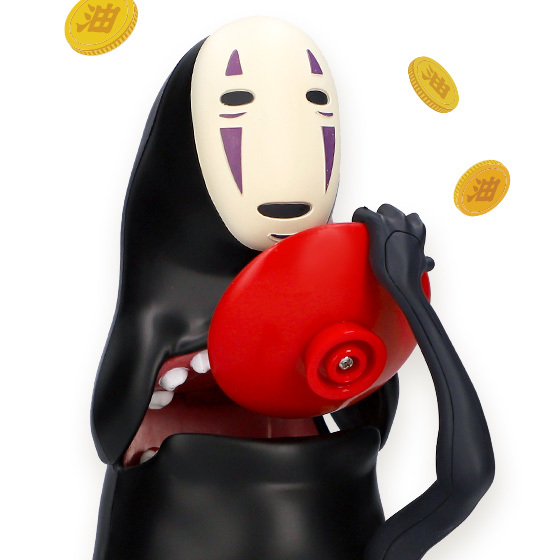 本次《神隱少女》20周年紀念再度推出的「更多!狼吞虎嚥 無臉男電動存錢筒」,將劇中無臉男在油屋內受到金錢與世俗觀的影響,什麼都想大口大口吞下肚的暴食模樣更加細膩還原,相較於前作,多了吃到鼓起來的雙頰與手指等更精緻的細節,另外,原本雙手捧著油屋酒碟的動作也變成單手拿著盤子、另一手則是拎著油屋員工青蛙的雙腳(也可以替換成鯛魚大餐)的生動造型!而在音效方面除了飽嗝聲「嗝~」之外,也追加有「我肚子餓了,全部拿來!」等台詞和流暢的音樂~
