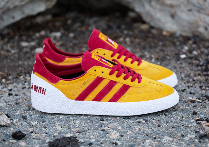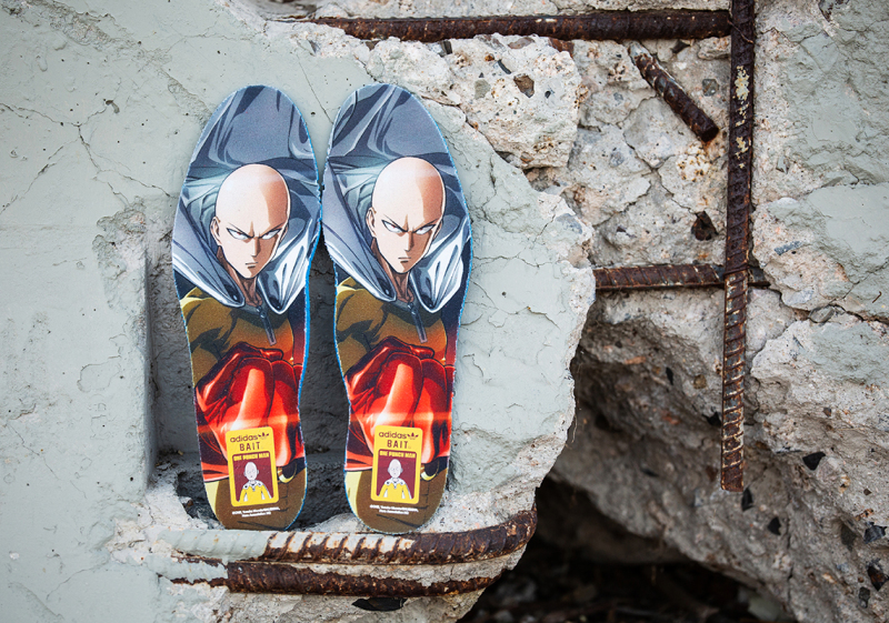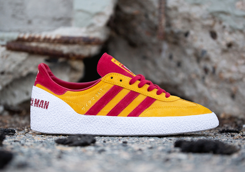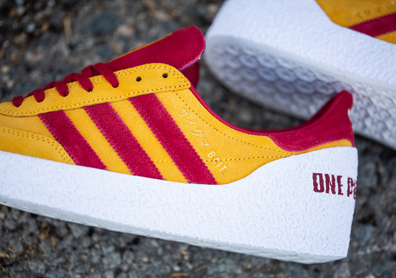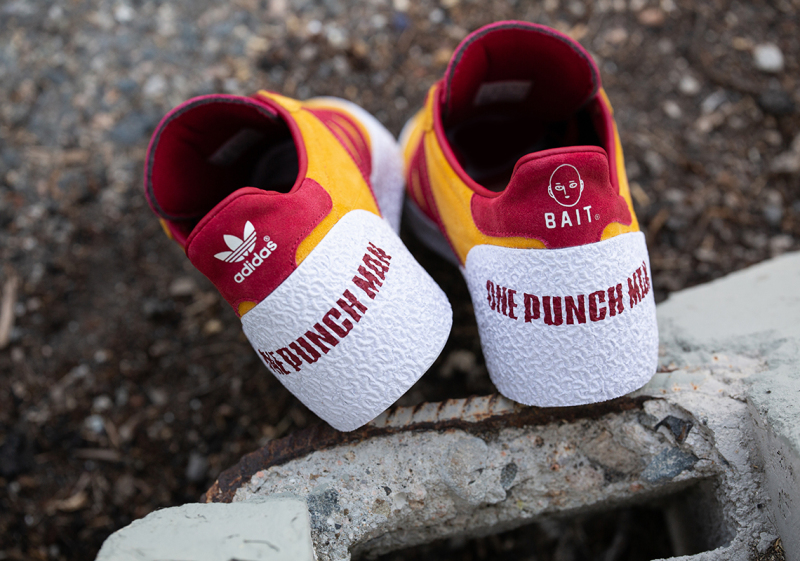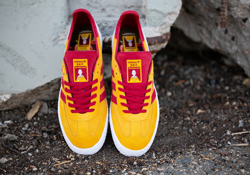 「BAIT x One Punch Man x Adidas Montreal」限定鞋款,以主角埼玉的英雄服為設計元素,醒目的深黃色為絨面麂皮底色,而鞋身的經典三條紋、鞋帶、鞋舌和鞋跟等處則是搭配亮眼的紅色,還原埼玉的招牌配色!除此之外,特色橡膠大底鞋跟夾上印有「One-Punch Man」字樣,側面則是「サイタマ(埼玉)」與 BAIT 的燙金字樣點綴;而鞋舌和鞋墊也有兩種對埼玉本描繪,分別是 ONE 的網絡漫畫原作版和漫畫家村田雄介的帥氣插畫版,全方面滿足一拳超人的粉絲~