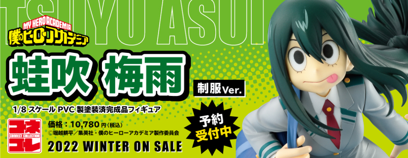 日本 BellFine 公司(株式会社ベルファイン)旗下以底座連結、完整展現作品世界觀的 Connect Collection(コネコレ)系列,在推出以人氣動漫《我的英雄學院》為題材的主角群綠谷出久、轟焦凍與麗日御茶子等商品後,穿著制服上學去的系列第五彈將推出「蛙吹梅雨 制服Ver.」1/8 比例 PVC 塗裝完成品,參考售價為 10,780 日圓,預計將於 2021 年 12 月發售。