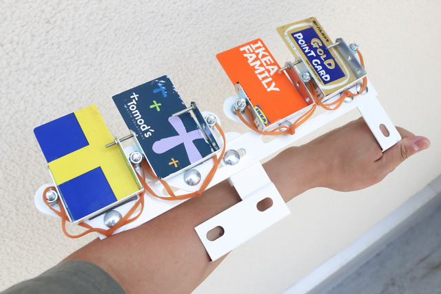 推主在推特上表示是因為平常錢包裡面太多卡片了,常常在結帳時都找個老半天,決定自己製作這個專屬的「卡片決鬥盤」,雖說外型簡陋,但因為結合橡皮筋與固定的設計,可以將卡片彈射出去,推主表示結帳時使用可以發射給店員使用 ( 這是什麼奇怪的想法 www )。