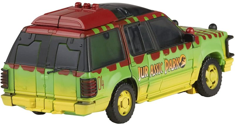 先來看看「Autobot JP93」吧!從侏儸紀公園遊園車 Ford Explorer 變形成機器人模式需要 18 個步驟,JP93 機器人模式高度來到 13.9 公分,有趣的是還融入了亞倫·葛蘭特博士(Dr. Alan Grant)沙色 Fedora 帽的元素,黑色爆能槍可以手持,汽車模式時也可以安裝在車頂,再看看汽車表面的塗裝與 Jurassic Park 標誌的印刷,超帥!