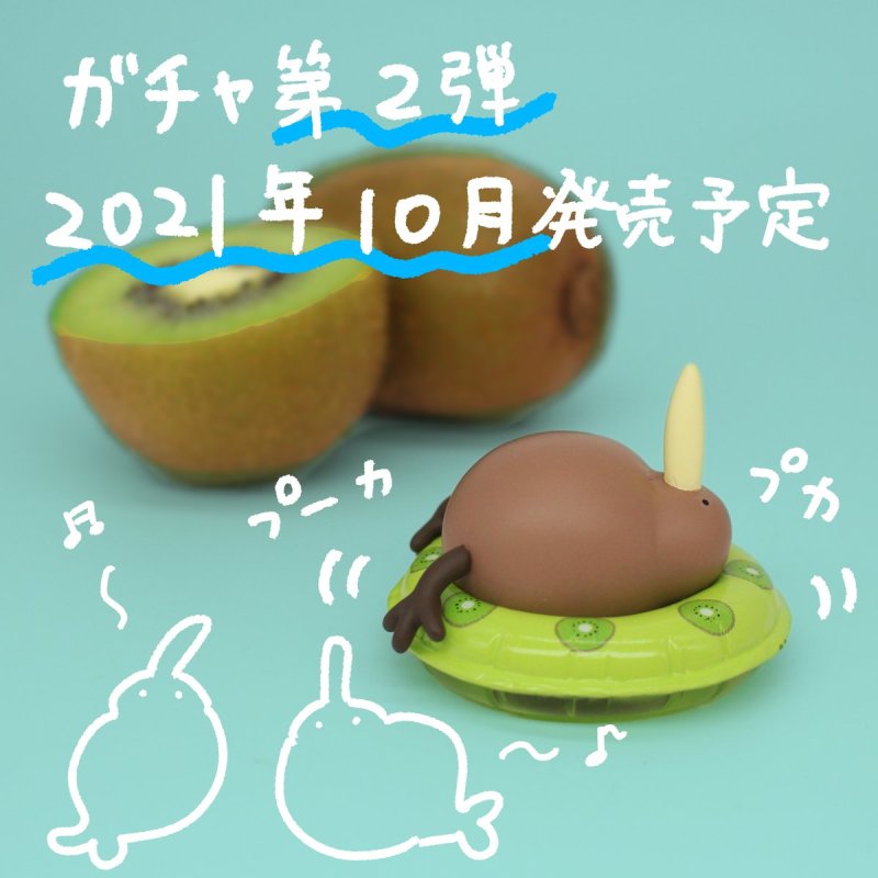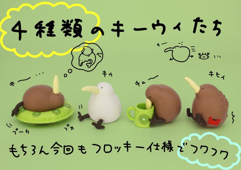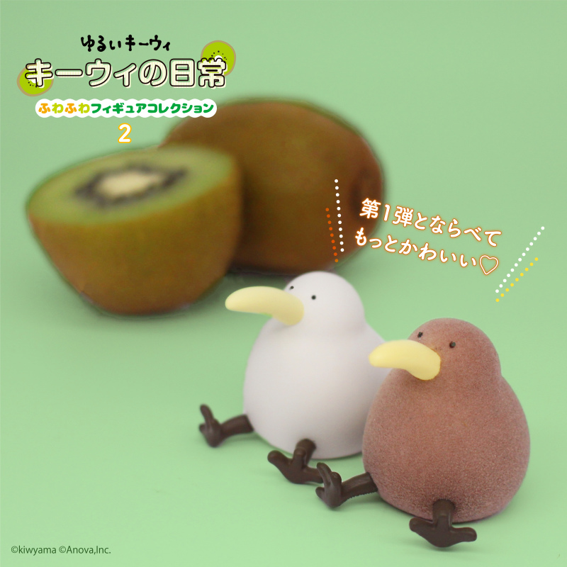 由 T-ARTS 發行的「奇異鳥的日常」不僅在迷你尺寸中充分還原「きう山」筆下的奇異果鳥,表面還採用絨布材質製作、形塑出有如真實奇異果摸起來的觸感,品名中的 "ふわふわ" 即是代表柔軟、蓬鬆的意思;這次的第二彈同樣有 4 款,包含躺在奇異果游泳圈的流動的奇異鳥(ながれるキーウィ)、坐著的白奇異鳥(おすわり白キーウィ)、喝東西的奇異鳥(あじわうキーウィ),跟被螃蟹夾到,嚇一跳的奇異鳥(びっくりキーウィ)。