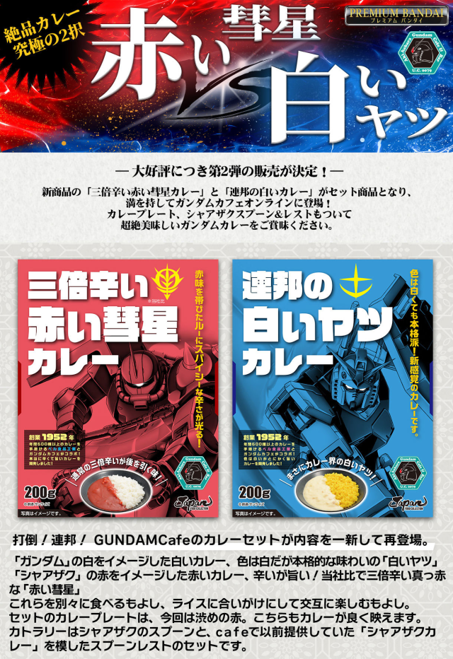 這次推出的咖哩分別以「三倍辣紅色彗星咖哩」&「聯邦白色咖哩」為賣點,官方也表示這兩者也可以混和搭配食用,創造出不同的風味。咖哩製作由日本創立超過 50 年的ベル食品工業株式會社製作,長年製作美味料理的調理包商品,品質上無須擔憂。