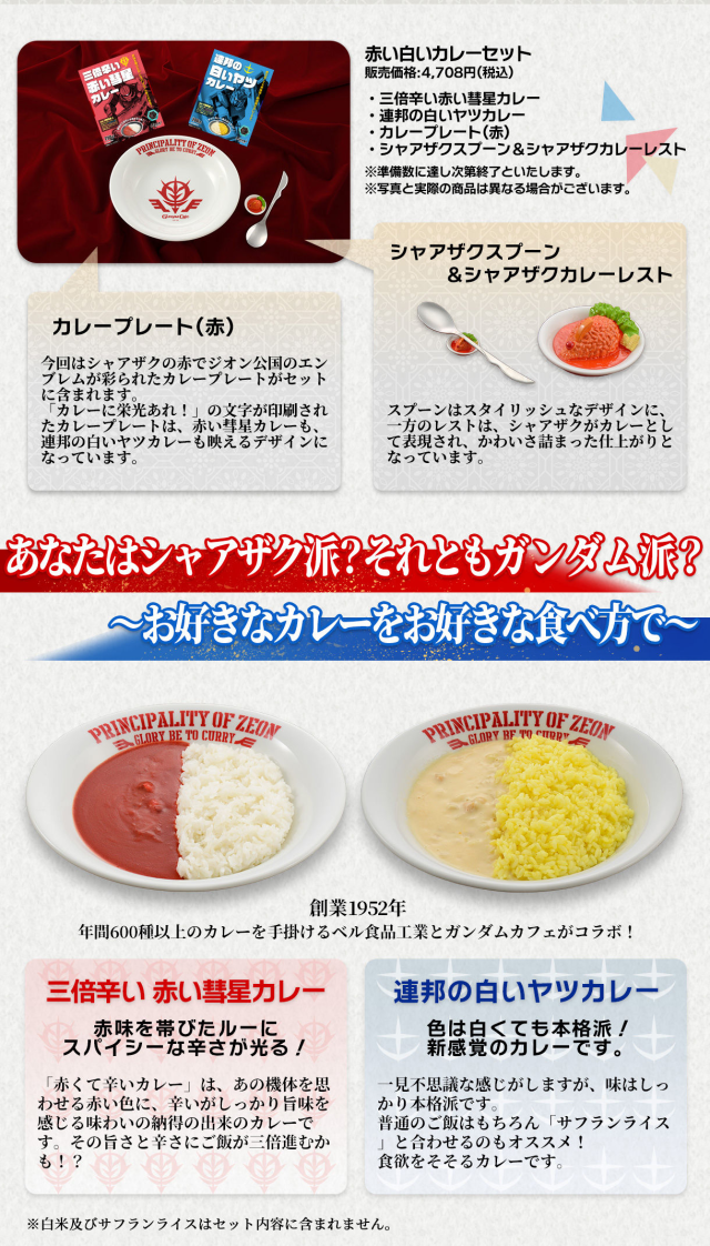 《機動戰士鋼彈》的官方咖啡廳「GUNDAM Café」相信不少鋼彈粉絲都熟知,也是不少鋼彈粉前去日本必須朝聖的一個地方。近日將推出店內頗受好評的咖哩料理食材組合-「紅色&白色咖哩組合」,以吉翁軍&聯邦軍兩者分別代表紅&白的意象設計,還附贈一個吉翁軍餐盤&夏亞薩克軍刀湯匙。售價為 4,708 日圓,目前可於日本萬代 PB 網站或 GUNDAM Café 線上商店訂購。