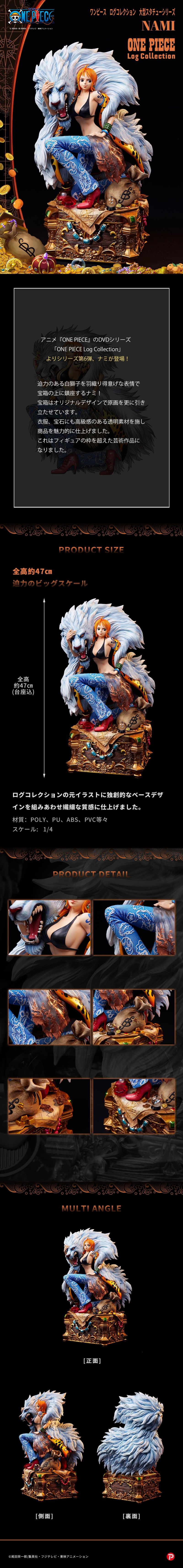 以《航海王》動畫 DVD 封面插畫為基礎製作的「ONE PIECE Log Collection」系列,採用 1/4 比例的大尺寸將作品精緻呈現,更以複合材質 POLYSTONE、PVC、ABS、銅、電鍍零件等精緻地打造各部質感。「ONE PIECE Log Collection 娜美」1/4 比例大型雕像,尺寸全高約 47 公分,將插畫中霸氣跨在寶箱上的娜美華麗打造!