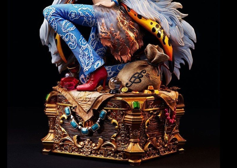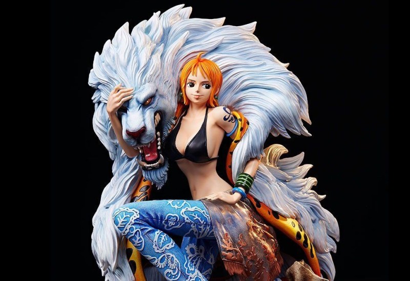 娜美作為系列中的第 6 彈作品,與系列一樣充滿豐富細節,極氣勢的白獅頭披在肩上,根根分明的毛髮厚重貴氣;招牌的橘色短髮與臉上俏皮的吐舌表情,展現娜美的個性~傲人上圍當然也不能少,雖然上身僅是簡單的黑色比基尼,下身服飾卻仔細刻劃了布質感與雕花、施以金屬光的透明材質薄紗等,腳踩的寶箱更是精心打造!寶箱複雜的紋路上零亂擺放著地圖、錢袋以及珠寶等,從各角度欣賞都能感受到作品令人驚嘆的華麗與精彩細節!