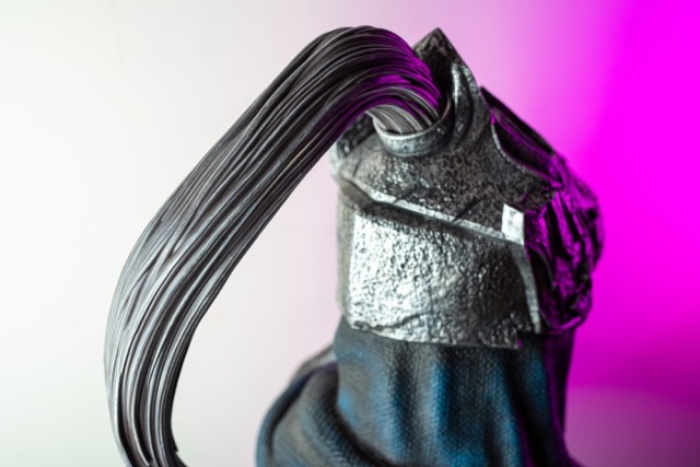 金屬質感搭配斗篷的布料材質對比起來效果非常好,馬尾裝上去之後也更有延伸感。