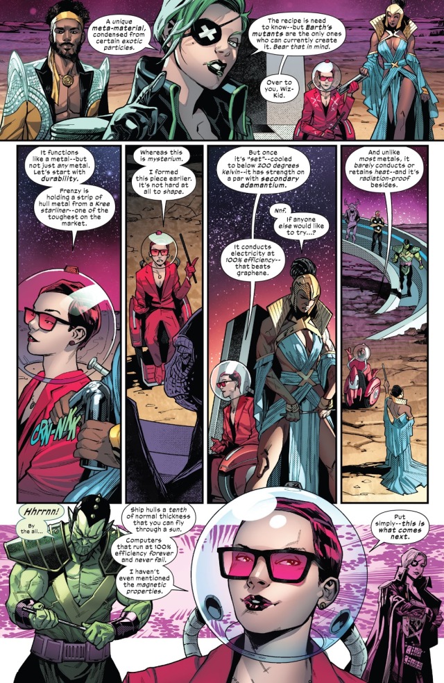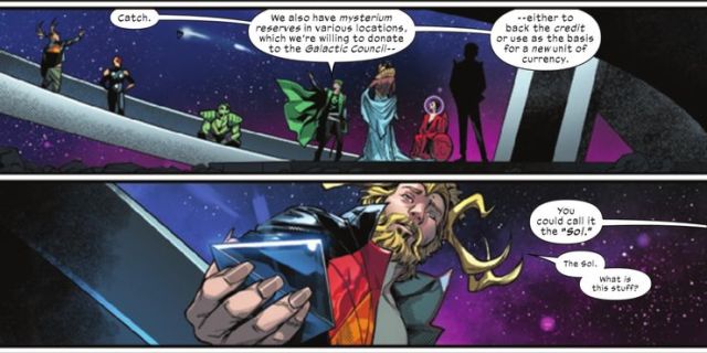 同時,在《King In Black》中,共生體之神Knull造成的破壞讓越來越多的文明失去了可以幫助聯盟的補給、基礎設施和資源。泛銀河系政府一直在試圖解決這個情況,而他們可能中了大獎。在最近的《S.W.O.R.D.》第六期當中,太陽系的變種人透過一種名為「秘金屬」(Mysterium)的修復了宇宙經濟,從而「買到」了自身在銀河系的合法性!