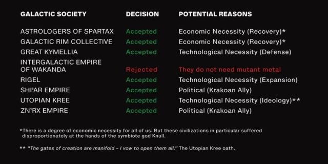 斯巴達克斯帝國(星爵的姊姊統治著這裡)和環銀河集合體急需從Knull造成的傷害中恢復,所以欣然接受了援助。同時,希阿帝國和Zn'rx帝國早已是克拉科的盟友,便接受了這份禮物,作為彼此政治友誼的象徵。只有星際瓦坎達帝國拒絕了變種人的金屬,畢竟他們有舉世無雙的振金(他們先前也拒絕了克拉科賣給全人類的神藥)。如同帕柏克在給他的皇帝的訊息中所解釋的,由秘金屬所製造的通貨「太陽幣」已成為一個非正式的術語,用來表示整個宇宙中市場“信用”的新化身。這不僅對X戰警與他們的變種人盟友來說,更對整個銀河系都是一項巨大的發展。