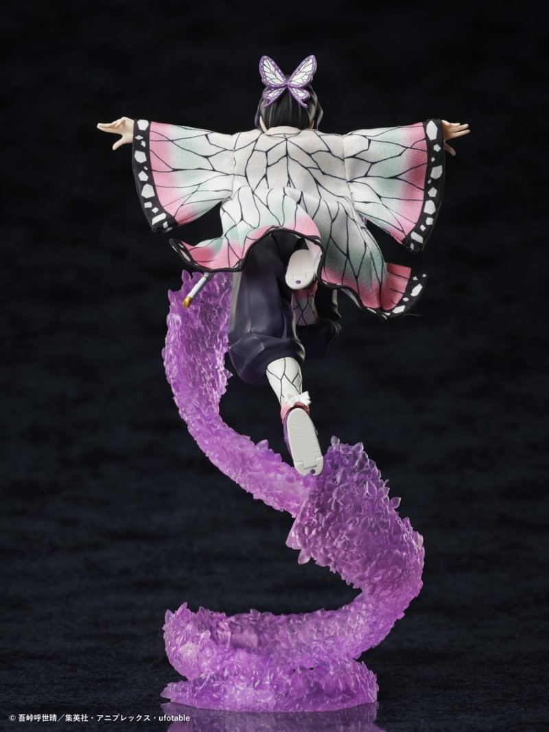配件中則附有「普通臉」、「笑臉」與溫柔的「閉眼臉」可替換,下半身則有「正坐造型替換零件」「座墊」能擺設出嫻雅姿態。鬼殺隊士不可或缺的「日輪刀」細膩刻畫出特徵的蝶翼型刀鍔與刺劍型刀身,搭配以萬千蝴蝶造型構成的「可動式特效零件」,再現施展「蟲之呼吸」時的優雅戰鬥姿態!