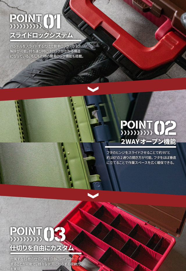 這次萬代以堅固牢靠的工具定位出發,可以放置釣具或是工業用品,讓使用者能夠安心的攜帶自己所需的用品。透過在手把上設置固定裝置,在攜帶時牢牢鎖住的結構,防止在任何情況下內部的物品散落。