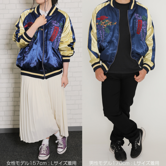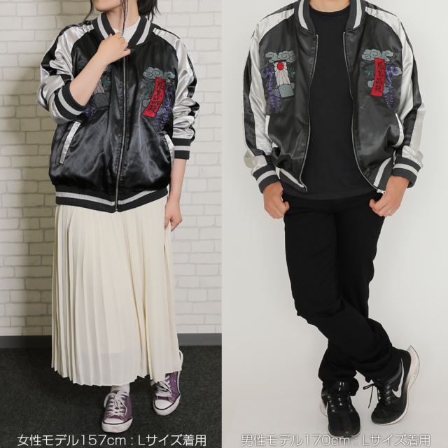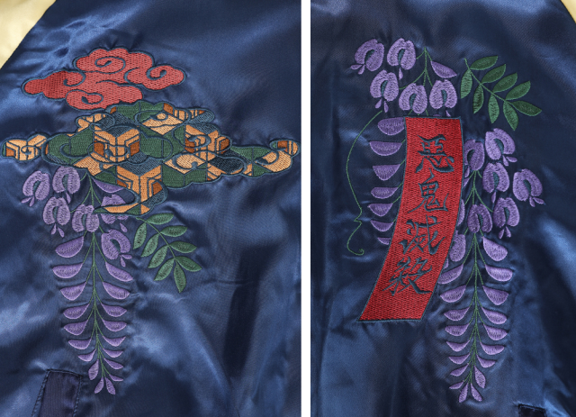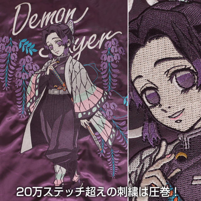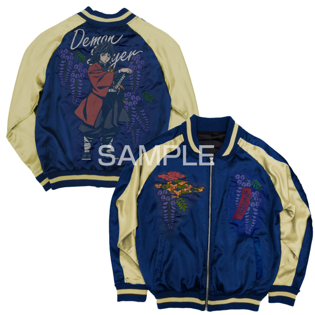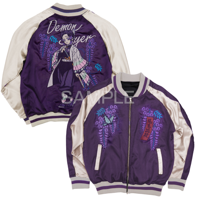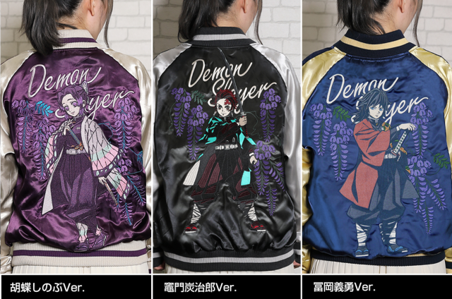 三款橫須賀外套皆以高技術的刺繡工藝呈現,結合人物圖像以及劇中具有驅除惡鬼重要象徵的「紫藤花」作結合,分別以不同的配色展現出不一樣的風貌。緞面的材質及大面積的職人工藝刺繡配上和風的圖案設計,打造出滿滿日本氣息的風格,宛如藝術品的刺繡讓人目不轉睛。