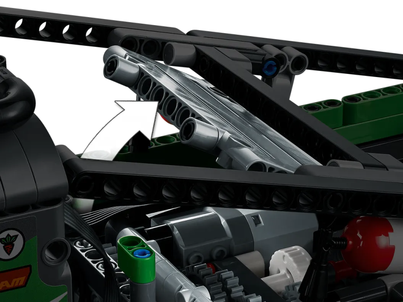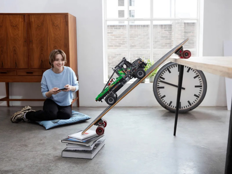 再來是能夠利用動力系統與專屬 APP「CONTROL+」進行操控的賓士攀岩卡車,整體是以水泥灰搭配亮綠色為主調,組裝完成之後高約 21 公分,長度也有 48 公分,科技零件勾勒出來的車頭形狀、賓士的 LOGO 非常帥氣,藉著四輪搭載的懸吊、轉向系統即可讓這台車應付各種崎嶇地形,動力配置部分共附上 3 個大型、1 個中型規格的馬達,值得一提的是,本作還有首度注入的差速器鎖(Differential Locking)功能,讓你在操縱的時候獲得更多樂趣。