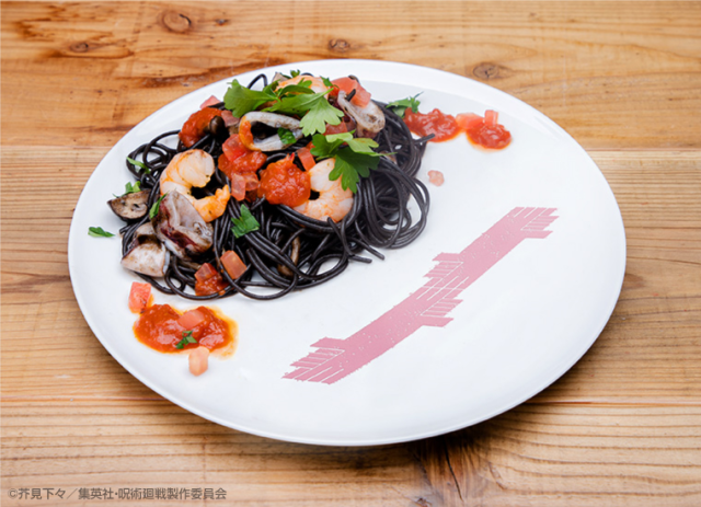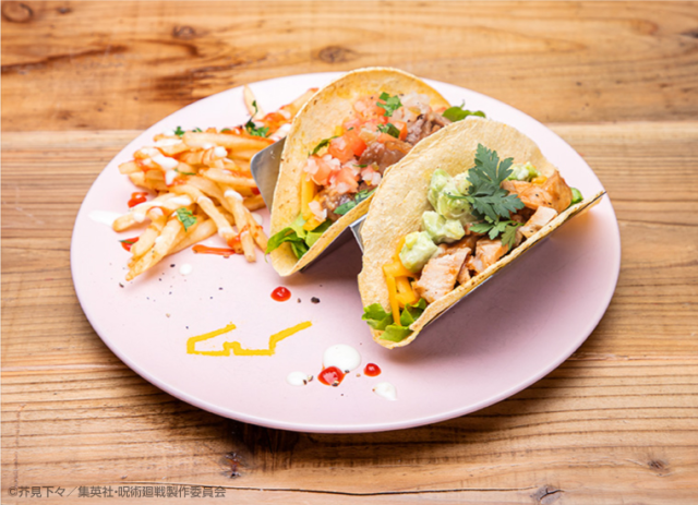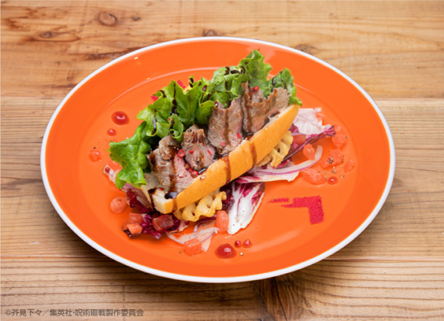 角色形象餐點包含虎杖悠仁(牛排三明治餐盤)、伏黑惠(影色義大利麵) 、釘崎野薔薇(草莓鬆餅) 、禪院真希(墨西哥卷餅餐盤)、狗巻棘(飯糰餐盤)、熊貓(布丁聖代)、五条悟(冰菓「茈」)餐點──搭配飲料套餐約2000日圓。