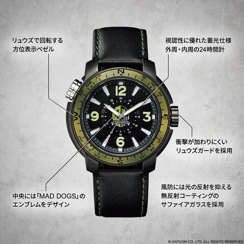 「MAD DOGS 美國特種部隊軍事手錶」這款是為了紀念《惡靈古堡》系列 25 周年,所以限量 2,500 組。以軍事風格出發,展現出劇中美軍特種部隊-MAD DOGS 的風格,錶面中心有著專屬的標誌,以黑色與軍綠色為基底設計。具有耐腐蝕性和耐用性的不銹鋼材料、抗震機芯、防水和磷光飾面,展現出特種部隊的高需求。