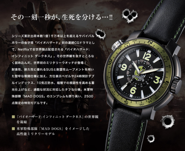 Netflix 預定於 2021 年全球獨佔播映,以日本 CAPCOM 人氣恐怖遊戲《惡靈古堡》為題材的最新動畫影集《惡靈古堡:無盡闇黑》(Resident Evil:Infinite Darkness)。近日宣布與手錶廠牌 PREMICO (プレミコ)共同發行限定款官方授權的「MAD DOGS 美國特種部隊軍事手錶」,限量 2,500 組,售價為 43,780 日圓 ( 稅入 ),目前可在 PREMICO 預購。