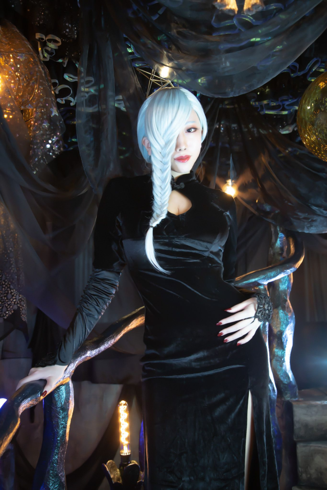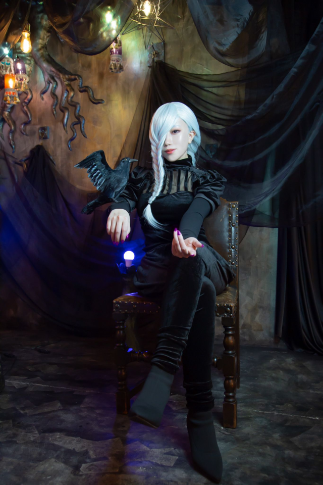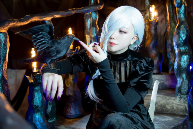 coser 紺透過白色長髮的辮子,遮住臉的半邊,展現出冥冥在設定中的美豔風貌,配合冥冥的術式「黑鳥操術」所使用的烏鴉,完整呈現她獨有的特殊氣息。
