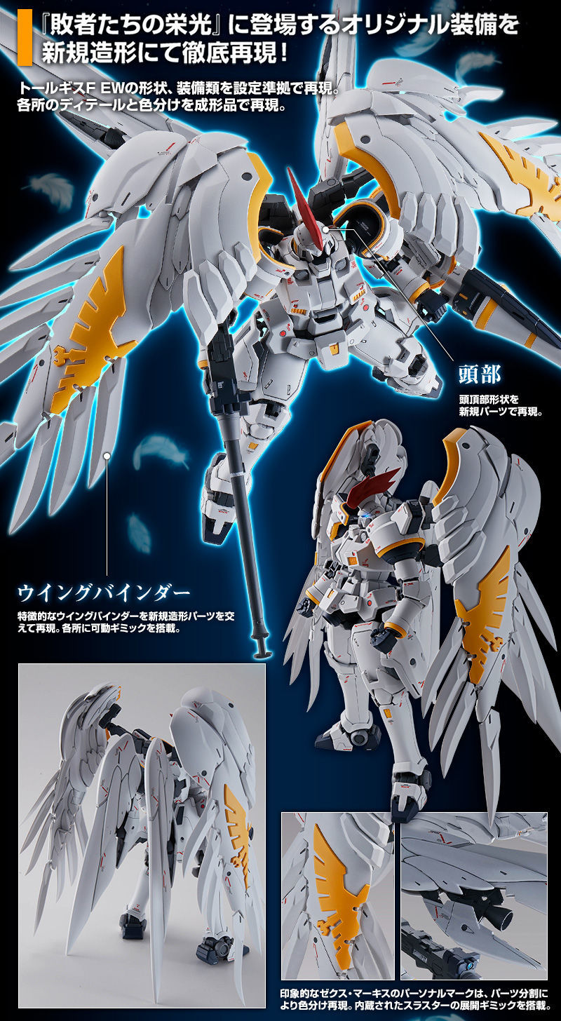 由日本 BANDAI SPIRITS 公司 HOBBY 事業部發行,搭配著最新技術、分件完整且高度可動的鋼普拉『MG(Master Grade)』系列今(07)日發表了出自漫畫《新機動戰記鋼彈W Endless Waltz 敗者們的榮耀》的最新商品「MG 1/100 托爾吉斯F EW」預計於 2021 年 10 月發售的消息。此商品僅在官方網路商店 PREMIUM BANDAI 限定販售。